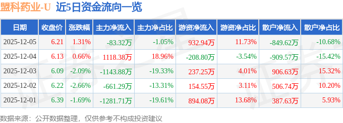 证券之星消息,截至2025年12月5日收盘,盟科药业(688373)报收于6.21元,上涨1.31%,换手率2.45%,成交量12.89万手,成交额7955.67万元。