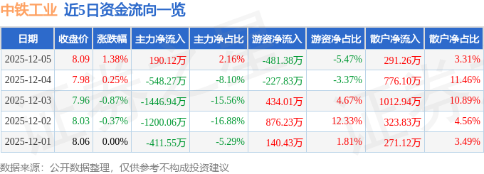 证券之星消息,截至2025年12月5日收盘,中铁工业(600528)报收于8.09元,上涨1.38%,换手率0.49%,成交量10.94万手,成交额8797.26万元。