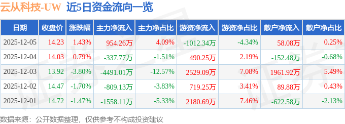 证券之星消息,截至2025年12月5日收盘,云从科技(688327)报收于14.23元,上涨1.43%,换手率1.98%,成交量16.49万手,成交额2.33亿元。