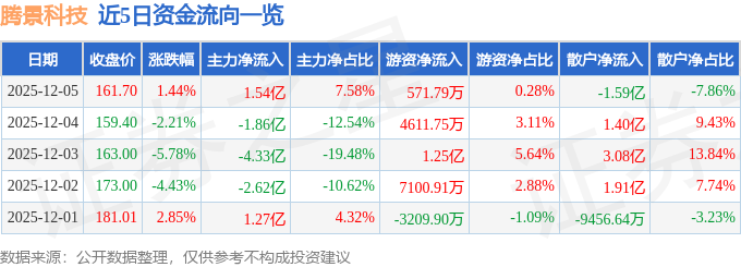 12月5日的资金流向数据方面,主力资金净流入1.54亿元,占总成交额7.58%,游资资金净流入571.79万元,占总成交额0.28%,散户资金净流出1.59亿元,占总成交额7.86%。