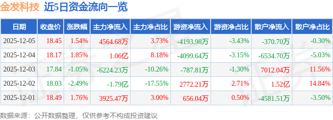 12月5日的资金流向数据方面,主力资金净流入4564.68万元,占总成交额3.73%,游资资金净流出4193.98万元,占总成交额3.43%,散户资金净流出370.7万元,占总成交额0.3%。