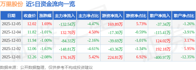 证券之星消息,截至2025年12月5日收盘,万里股份(600847)报收于12.02元,上涨1.69%,换手率1.63%,成交量2.5万手,成交额2964.22万元。