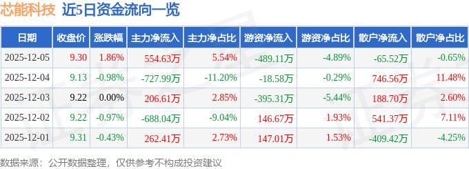 12月5日的资金流向数据方面,主力资金净流入554.63万元,占总成交额5.54%,游资资金净流出489.11万元,占总成交额4.89%,散户资金净流出65.52万元,占总成交额0.65%。