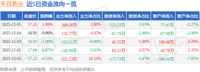 证券之星消息,截至2025年12月5日收盘,天目药业(600671)报收于17.23元,上涨1.89%,换手率1.63%,成交量1.98万手,成交额3395.56万元。