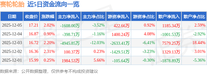 证券之星消息,截至2025年12月5日收盘,赛轮轮胎(601058)报收于17.21元,上涨2.02%,换手率0.81%,成交量26.7万手,成交额4.57亿元。