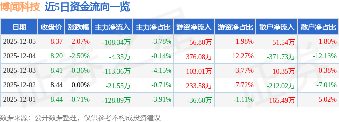 证券之星消息,截至2025年12月5日收盘,博闻科技(600883)报收于8.37元,上涨2.07%,换手率1.47%,成交量3.47万手,成交额2866.43万元。