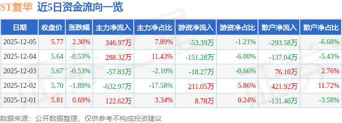 证券之星消息,截至2025年12月5日收盘,ST复华(600624)报收于5.77元,上涨2.3%,换手率1.13%,成交量7.71万手,成交额4396.85万元。