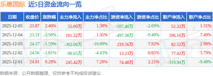 证券之星消息,截至2025年12月5日收盘,乐惠国际(603076)报收于23.87元,上涨2.4%,换手率1.41%,成交量1.7万手,成交额3999.47万元。