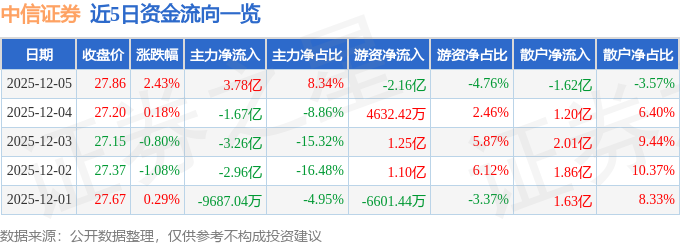 证券之星消息,截至2025年12月5日收盘,中信证券(600030)报收于27.86元,上涨2.43%,换手率1.35%,成交量163.79万手,成交额45.36亿元。