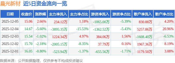证券之星消息,截至2025年12月5日收盘,晨光新材(605399)报收于15.06元,上涨2.66%,换手率4.29%,成交量13.37万手,成交额1.98亿元。