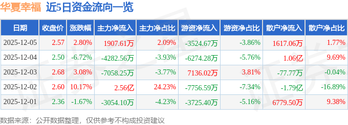 证券之星消息,截至2025年12月5日收盘,华夏幸福(600340)报收于2.57元,上涨2.8%,换手率9.18%,成交量357.4万手,成交额9.13亿元。