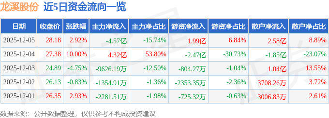 证券之星消息,截至2025年12月5日收盘,龙溪股份(600592)报收于28.18元,上涨2.92%,换手率25.9%,成交量103.47万手,成交额29.06亿元。