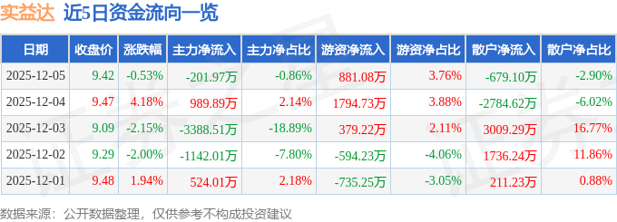 证券之星消息,截至2025年12月5日收盘,实益达(002137)报收于9.42元,下跌0.53%,换手率6.3%,成交量24.96万手,成交额2.34亿元。