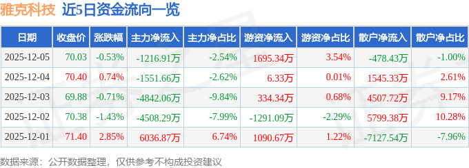 证券之星消息,截至2025年12月5日收盘,雅克科技(002409)报收于70.03元,下跌0.53%,换手率2.15%,成交量6.86万手,成交额4.78亿元。