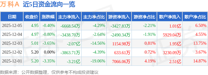 证券之星消息,截至2025年12月5日收盘,万 科A(000002)报收于4.95元,下跌0.4%,换手率3.27%,成交量318.1万手,成交额15.53亿元。