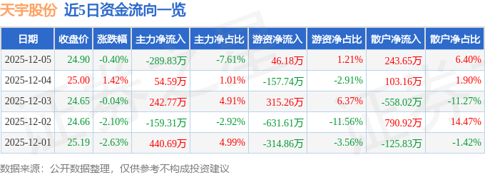 证券之星消息,截至2025年12月5日收盘,天宇股份(300702)报收于24.9元,下跌0.4%,换手率0.73%,成交量1.53万手,成交额3807.16万元。