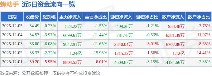 证券之星消息,截至2025年12月5日收盘,蜂助手(301382)报收于34.49元,下跌0.23%,换手率5.55%,成交量9.79万手,成交额3.38亿元。