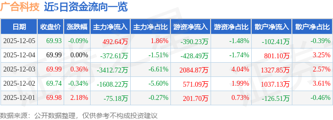 证券之星消息,截至2025年12月5日收盘,广合科技(001389)报收于69.93元,下跌0.09%,换手率2.52%,成交量3.79万手,成交额2.64亿元。
