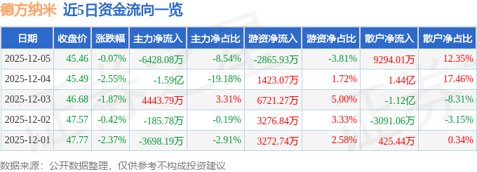 证券之星消息,截至2025年12月5日收盘,德方纳米(300769)报收于45.46元,下跌0.07%,换手率6.63%,成交量16.7万手,成交额7.52亿元。