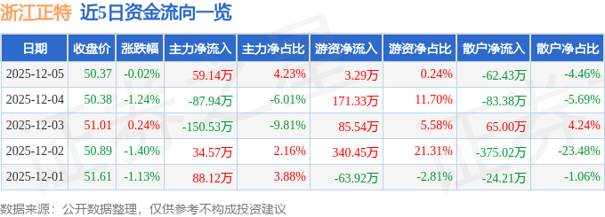证券之星消息,截至2025年12月5日收盘,浙江正特(001238)报收于50.37元,下跌0.02%,换手率0.27%,成交量2779.0手,成交额1398.74万元。