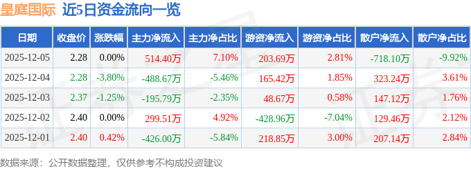 证券之星消息,截至2025年12月5日收盘,皇庭国际(000056)报收于2.28元,上涨0.0%,换手率3.57%,成交量32.29万手,成交额7240.87万元。
