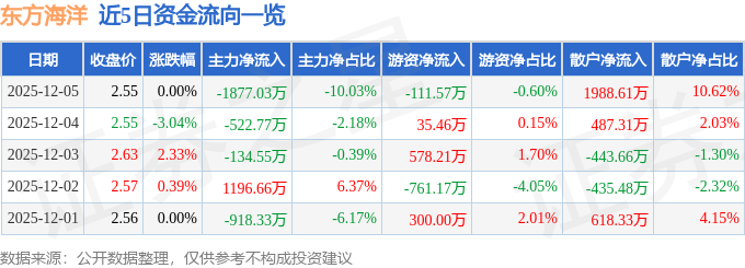 证券之星消息,截至2025年12月5日收盘,东方海洋(002086)报收于2.55元,上涨0.0%,换手率4.71%,成交量74.54万手,成交额1.87亿元。