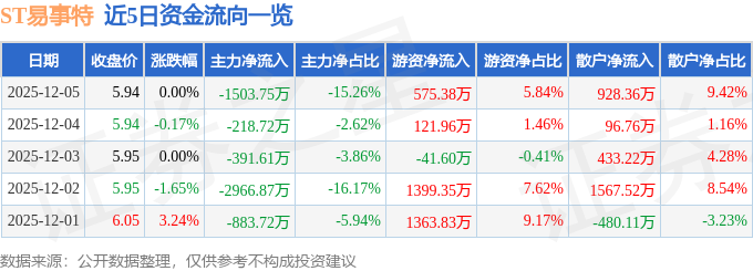 12月5日的资金流向数据方面,主力资金净流出1503.75万元,占总成交额15.26%,游资资金净流入575.38万元,占总成交额5.84%,散户资金净流入928.36万元,占总成交额9.42%。