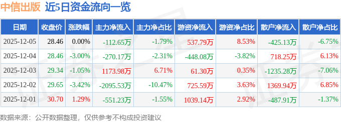 证券之星消息,截至2025年12月5日收盘,中信出版(300788)报收于28.46元,上涨0.0%,换手率1.17%,成交量2.22万手,成交额6302.56万元。