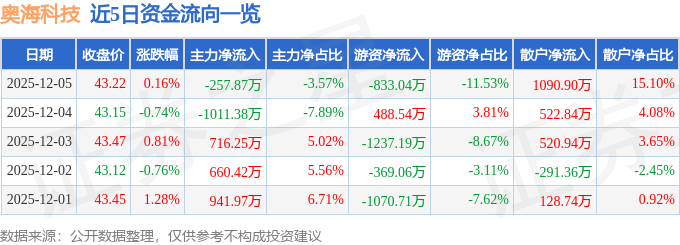 证券之星消息,截至2025年12月5日收盘,奥海科技(002993)报收于43.22元,上涨0.16%,换手率0.7%,成交量1.68万手,成交额7224.31万元。