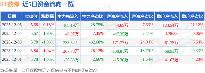 证券之星消息,截至2025年12月5日收盘,ST数源(000909)报收于5.68元,上涨0.18%,换手率0.24%,成交量1.03万手,成交额584.92万元。