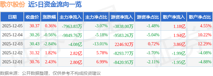 证券之星消息,截至2025年12月5日收盘,歌尔股份(002241)报收于30.37元,上涨0.36%,换手率2.76%,成交量86.64万手,成交额25.96亿元。
