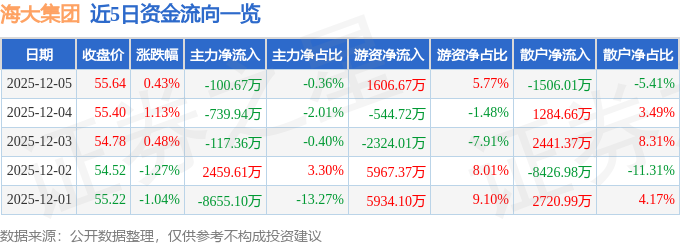 证券之星消息,截至2025年12月5日收盘,海大集团(002311)报收于55.64元,上涨0.43%,换手率0.3%,成交量5.0万手,成交额2.78亿元。