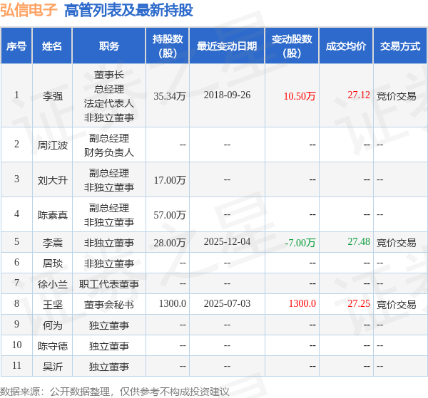 弘信电子的高管列表及最新持股情况如下: