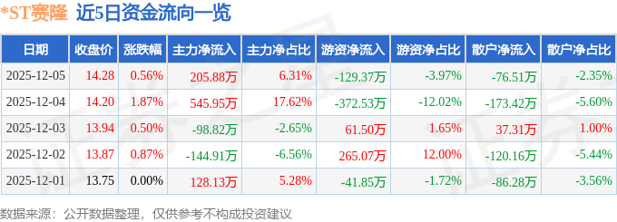 证券之星消息,截至2025年12月5日收盘,*ST赛隆(002898)报收于14.28元,上涨0.56%,换手率2.26%,成交量2.29万手,成交额3260.49万元。