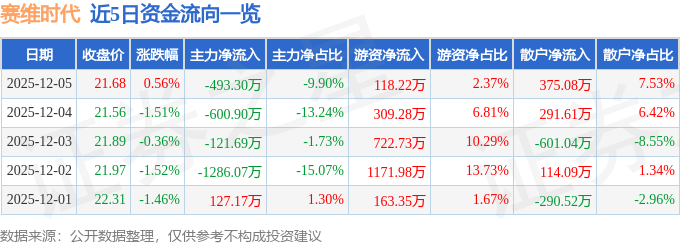 证券之星消息,截至2025年12月5日收盘,赛维时代(301381)报收于21.68元,上涨0.56%,换手率1.18%,成交量2.31万手,成交额4980.67万元。