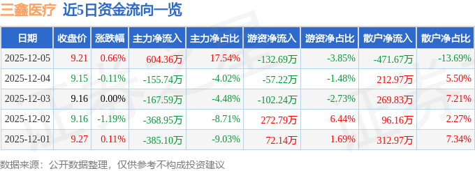 证券之星消息,截至2025年12月5日收盘,三鑫医疗(300453)报收于9.21元,上涨0.66%,换手率1.05%,成交量3.76万手,成交额3446.52万元。