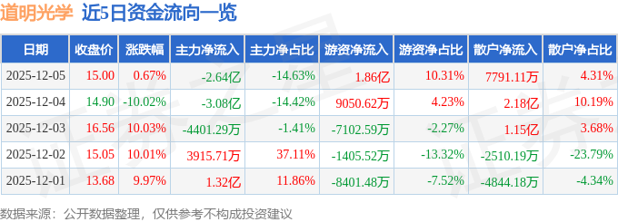 证券之星消息,截至2025年12月5日收盘,道明光学(002632)报收于15.0元,上涨0.67%,换手率20.8%,成交量121.03万手,成交额18.06亿元。