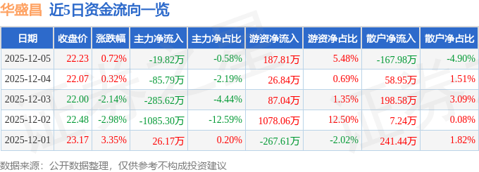 证券之星消息,截至2025年12月5日收盘,华盛昌(002980)报收于22.23元,上涨0.72%,换手率1.52%,成交量1.54万手,成交额3426.57万元。