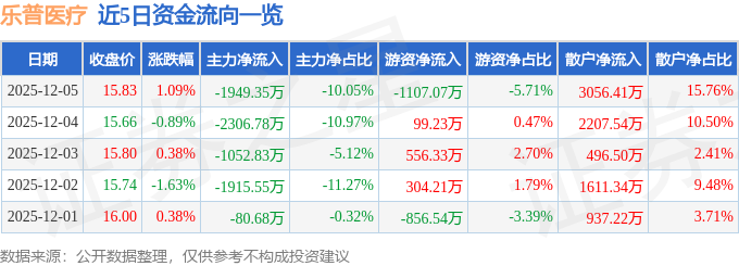 证券之星消息,截至2025年12月5日收盘,乐普医疗(300003)报收于15.83元,上涨1.09%,换手率0.78%,成交量12.34万手,成交额1.94亿元。