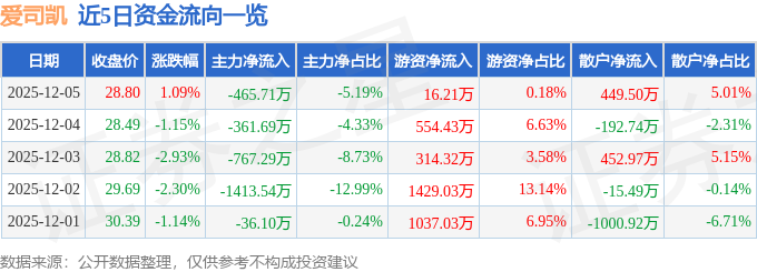 12月5日的资金流向数据方面,主力资金净流出465.71万元,占总成交额5.19%,游资资金净流入16.21万元,占总成交额0.18%,散户资金净流入449.5万元,占总成交额5.01%。