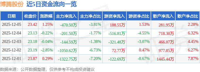 12月5日的资金流向数据方面,主力资金净流出470.5万元,占总成交额3.81%,游资资金净流入188.55万元,占总成交额1.53%,散户资金净流入281.95万元,占总成交额2.28%。
