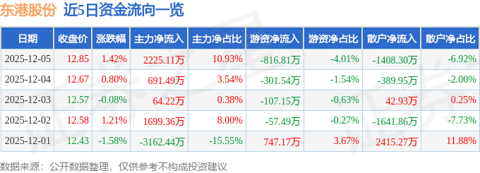 证券之星消息,截至2025年12月5日收盘,东港股份(002117)报收于12.85元,上涨1.42%,换手率3.04%,成交量15.93万手,成交额2.04亿元。