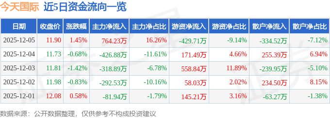 12月5日的资金流向数据方面,主力资金净流入764.23万元,占总成交额16.26%,游资资金净流出429.71万元,占总成交额9.14%,散户资金净流出334.52万元,占总成交额7.12%。