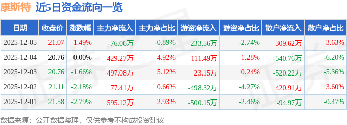 证券之星消息,截至2025年12月5日收盘,康斯特(300445)报收于21.07元,上涨1.49%,换手率2.88%,成交量4.09万手,成交额8526.55万元。