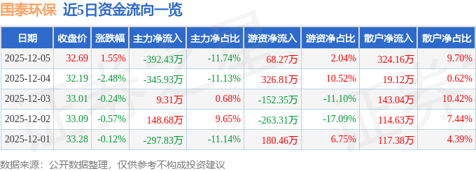 证券之星消息,截至2025年12月5日收盘,国泰环保(301203)报收于32.69元,上涨1.55%,换手率2.34%,成交量1.03万手,成交额3341.43万元。