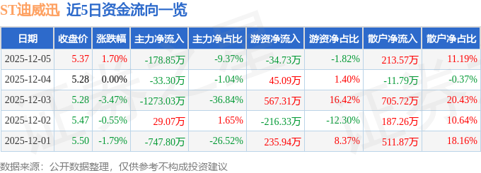 证券之星消息,截至2025年12月5日收盘,ST迪威迅(300167)报收于5.37元,上涨1.7%,换手率1.0%,成交量3.6万手,成交额1908.08万元。