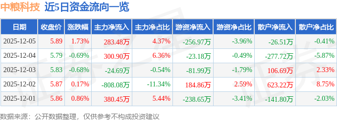 证券之星消息,截至2025年12月5日收盘,中粮科技(000930)报收于5.89元,上涨1.73%,换手率0.6%,成交量11.1万手,成交额6491.08万元。