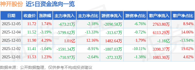 证券之星消息,截至2025年12月5日收盘,神开股份(002278)报收于11.72元,上涨1.74%,换手率7.97%,成交量26.61万手,成交额3.09亿元。