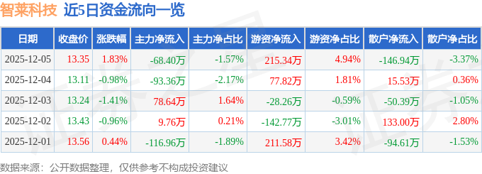证券之星消息,截至2025年12月5日收盘,智莱科技(300771)报收于13.35元,上涨1.83%,换手率1.82%,成交量3.3万手,成交额4356.19万元。
