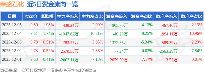 证券之星消息,截至2025年12月5日收盘,荣盛石化(002493)报收于9.8元,上涨1.98%,换手率0.24%,成交量22.52万手,成交额2.19亿元。